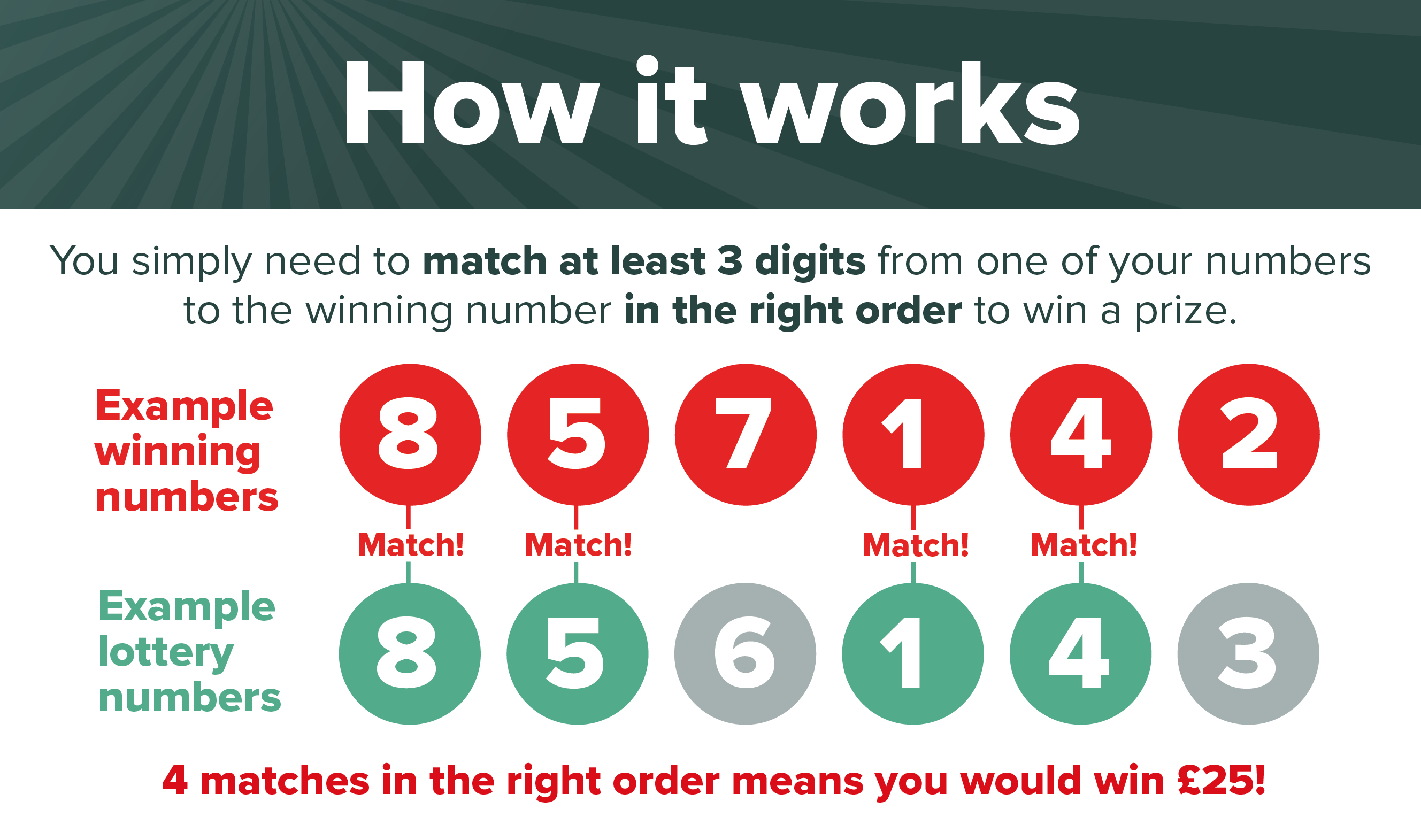 We’ll send you an email confirmation and a letter in the post confirming your entry to the Army Benevolent Fund Weekly Lottery, including your lucky six-digit unique lottery number(s).